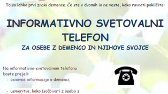 Informativno svetovalni telefon bo deloval vsako delovno sredo od 14.00 do 15.00 ure na telefonskištevilki 05 37 34 404. Svetovalci na telefonu bodo osebam z demenco in njihovim svojcem nudili osnovne informacije obolezni, usmeritve, kako (so)bivati za sebo z demenco in kaj lahko pričakujemo ob napredovanju bolezni ter informacije o možnih oblikah pomoči.